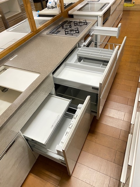 安いキッチンでは安価なレールを使用しているので、耐荷重の関係でなかなか手前まで引出しを引き出すことが出来ません。末永く使うものですのでそういったところまでこだわってみてはいかがでしょう。