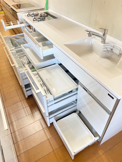 安いキッチンでは安価なレールを使用しているので、耐荷重の関係で引出し奥行が浅く、なかなか手前まで引き出すことも出来ません。こちらのキッチンは耐荷重性能が抜群に良いレールを採用していますので動きもスムーズで頑丈かつ引出し収納容量もたっぷりあります。末永く使うものですのでそういったところまでこだわってみてはいかがでしょう。