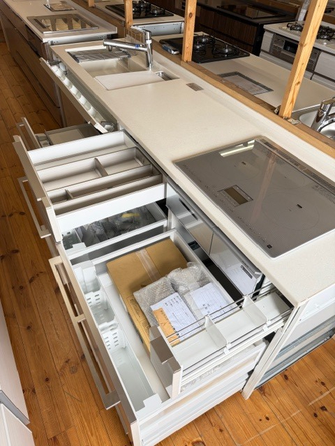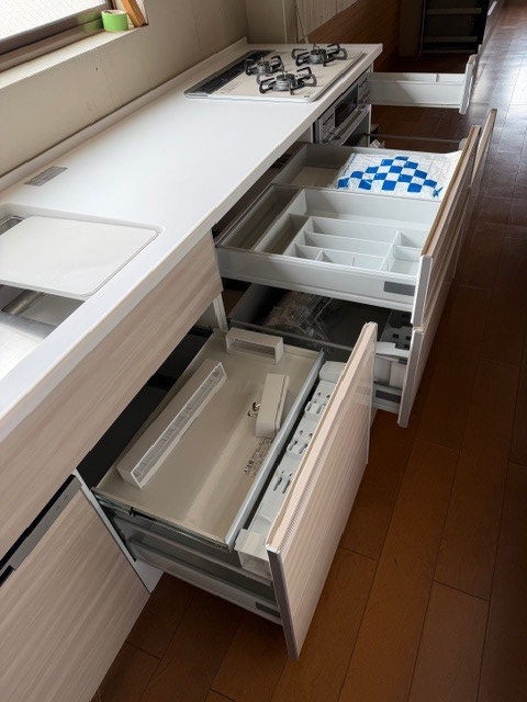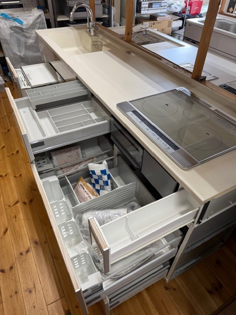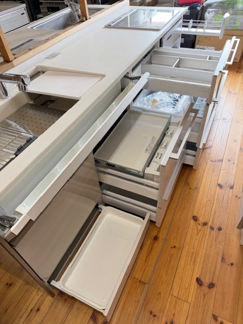 安いキッチンでは安価なレールを使用しているので、耐荷重の関係で引出し奥行が浅く、なかなか手前まで引き出すことも出来ません。こちらのキッチンは耐荷重性能が抜群に良いレールを採用していますので動きもスムーズで頑丈かつかなり手前まで引出し可能&収納容量もたっぷりあります。末永く使うものですのでそういったところまでこだわってみてはいかがでしょう。